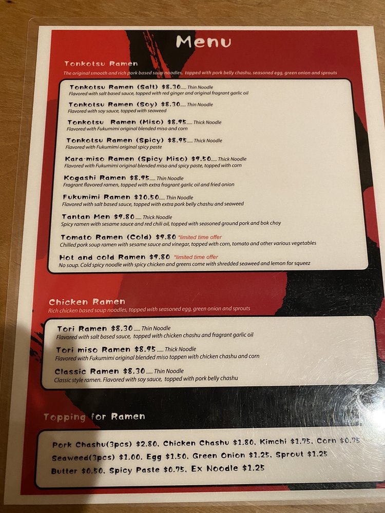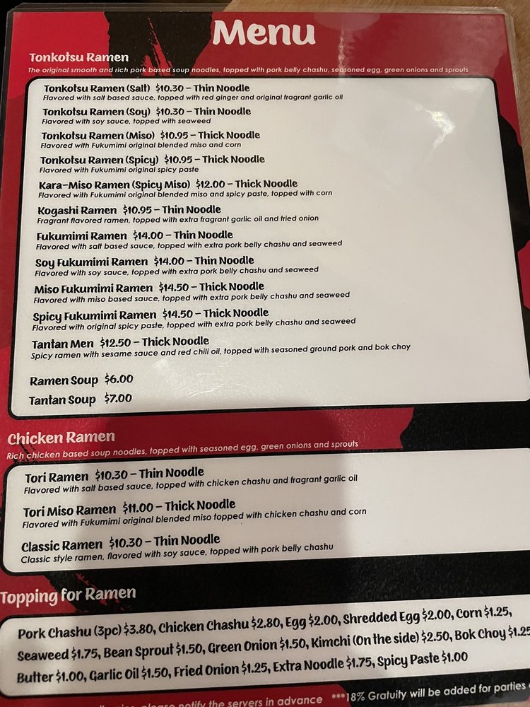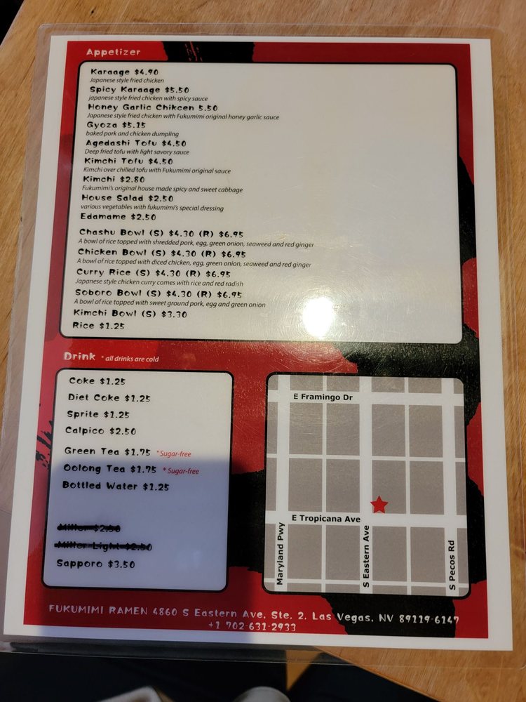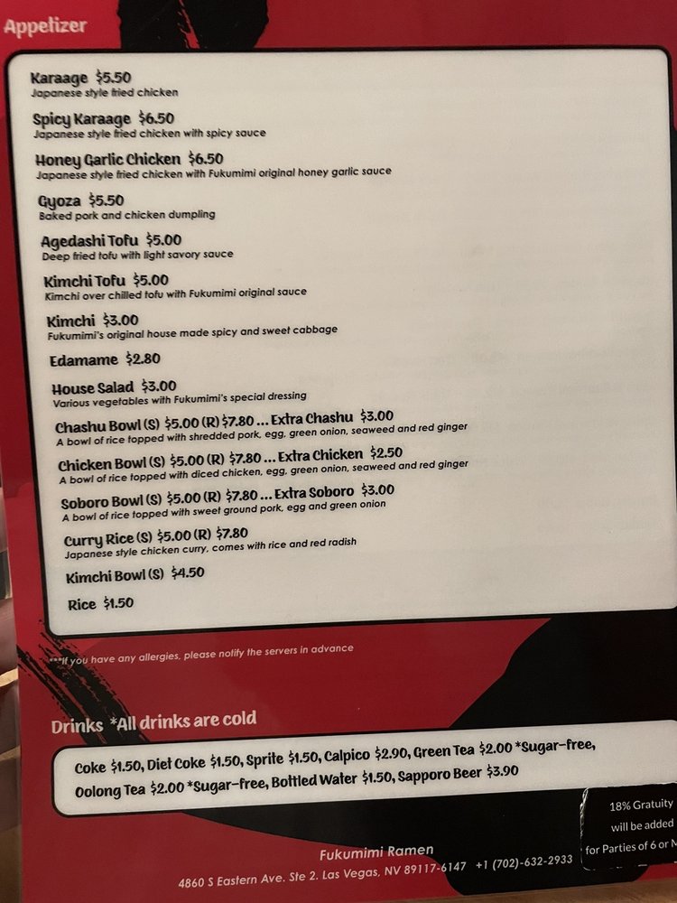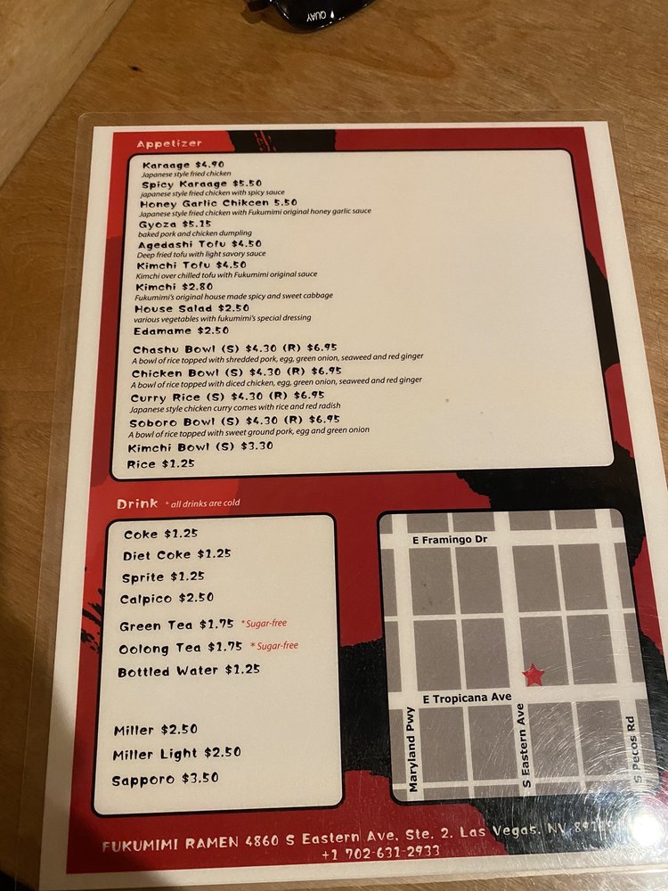 Fukumimi Ramen in Las Vegas offers a variety of ramen dishes with unique flavors. The menu includes classic options like the soy sauce-flavored Classic Ramen and the salt-based Tori Ramen. Customers praise the delicious Gyoza, Edamame, and House Salad appetizers. The Chicken Bowl and Chashu Bowl are popular rice options, while the Curry Rice and Kimchi Bowl offer tasty alternatives. Reviewers highlight the reasonable prices, friendly service, and cozy atmosphere of the restaurant. Fukumimi's special Fukumimi Ramen receives rave reviews for its flavor and value. With a range of options for meat-eaters and limited vegetarian choices, Fukumimi Ramen is a must-visit spot for ramen lovers in Vegas.