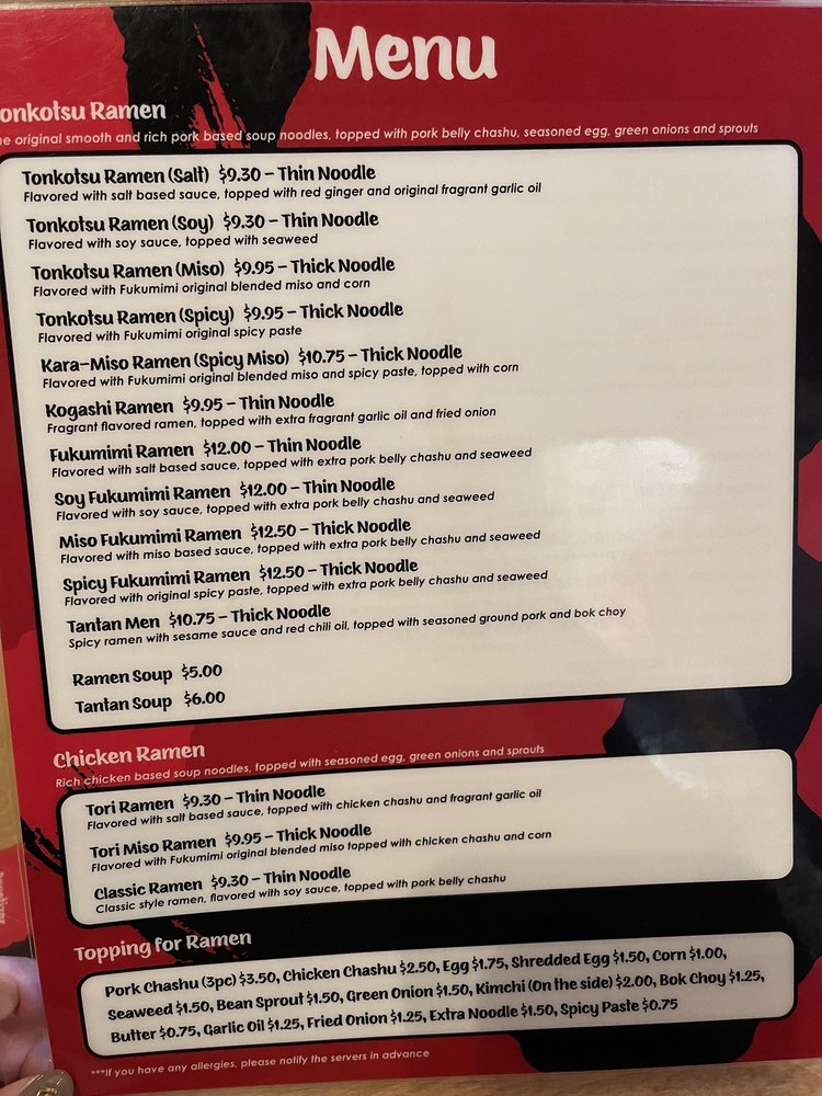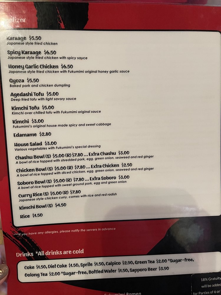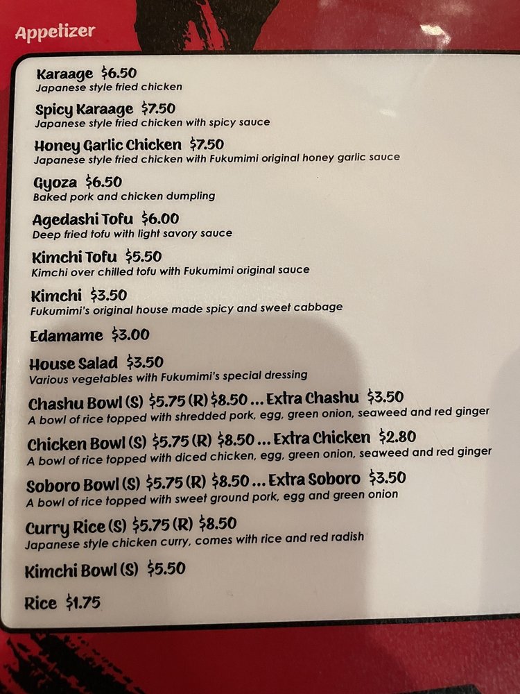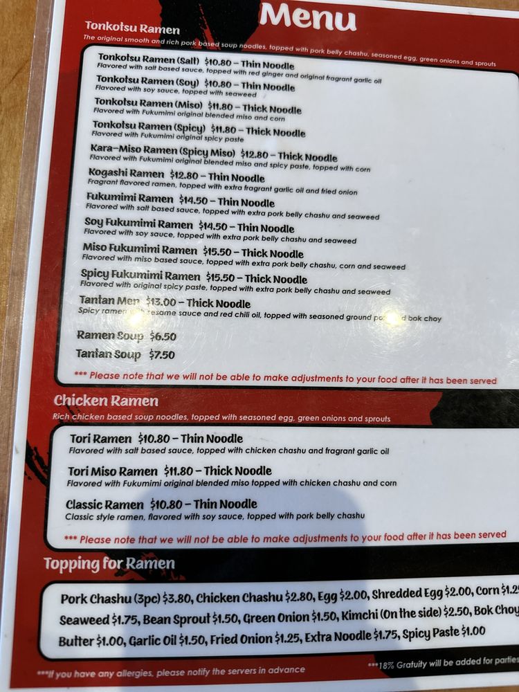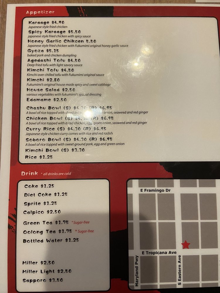 Fukumimi Ramen in Las Vegas offers a variety of ramen dishes with unique flavors. The menu includes classic options like the soy sauce-flavored Classic Ramen and the salt-based Tori Ramen. Customers praise the delicious Gyoza, Edamame, and House Salad appetizers. The Chicken Bowl and Chashu Bowl are popular rice options, while the Curry Rice and Kimchi Bowl offer tasty alternatives. Reviewers highlight the reasonable prices, friendly service, and cozy atmosphere of the restaurant. Fukumimi's special Fukumimi Ramen receives rave reviews for its flavor and value. With a range of options for meat-eaters and limited vegetarian choices, Fukumimi Ramen is a must-visit spot for ramen lovers in Vegas.